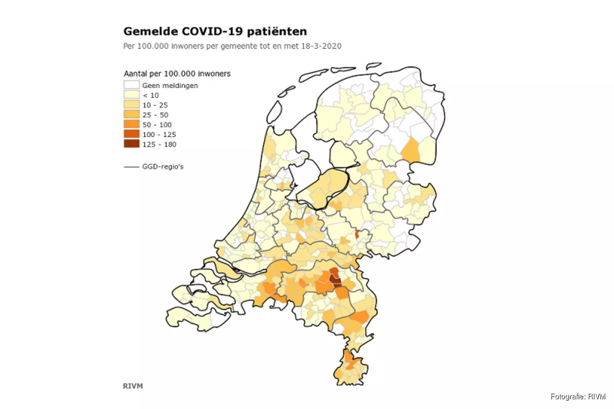 Sinds dinsdag wordt de verspreiding van het aantal positief geteste mensen in Nederland weergegeven met een incidentiekaart. De gekleurde vlakken geven niet het totale aantal positief geteste mensen weer, maar het aantal per 100.000 inwoners.