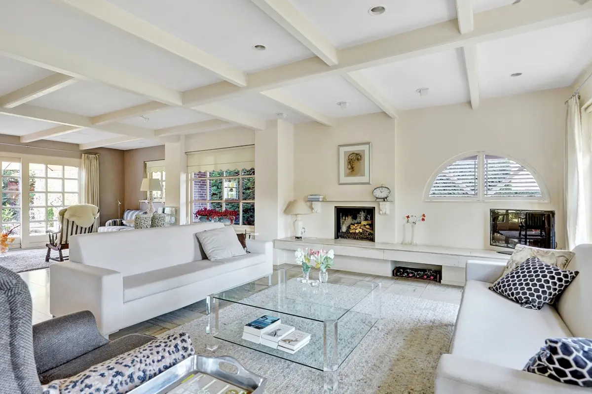 De woonkamer is royaal opgezet en strekt zich uit over de volledige breedte van de woning. De lichte wanden en grote raampartijen met roedeverdeling zorgen voor een schitterende lichtinval, terwijl de balkenplafonds en open haard voor een warme ambiance zorgen. Of u nu languit op de bank ligt met een goed boek – met prachtig zicht op het groen rondom de woning– of gasten ontvangt voor een etentje: dit is zo’n ruimte waar u zich metéén thuis voelt.
