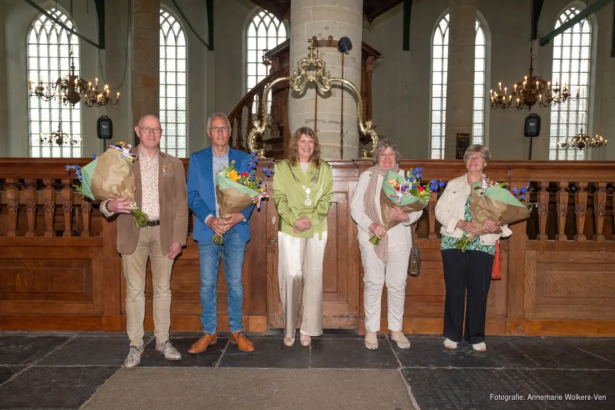 ENKHUIZEN - Tijdens een feestelijke bijeenkomst in de Westerkerk reikte burgemeester Jeltje Hoekstra-Sikkema op vrijdag 24 april 2026 een Koninklijke onderscheiding uit aan vier inwoners van Enkhuizen. De burgemeester haalde de decorandi thuis op in een historische brandweerwagen. In de Westerkerk werden ze in het zonnetje gezet en spelde burgemeester Hoekstra-Sikkema hen de onderscheiding op.